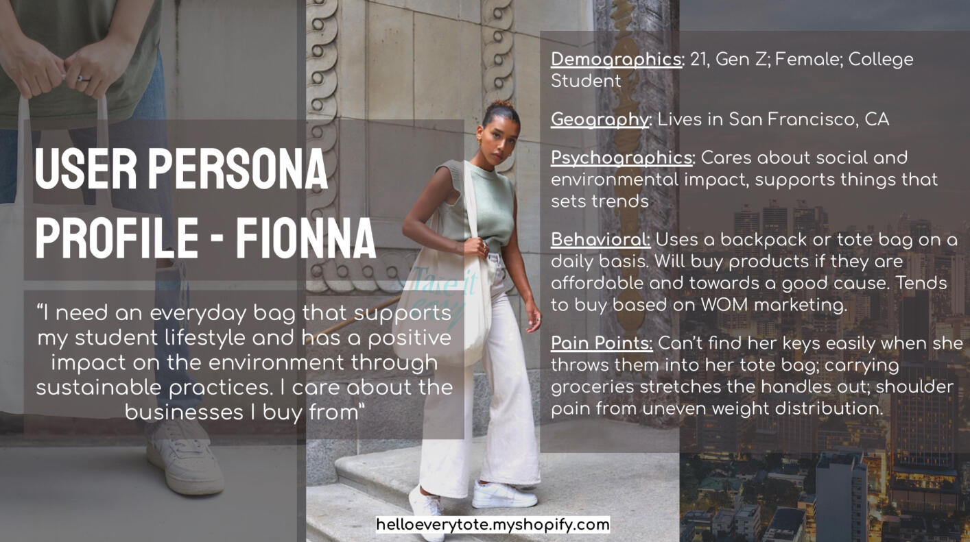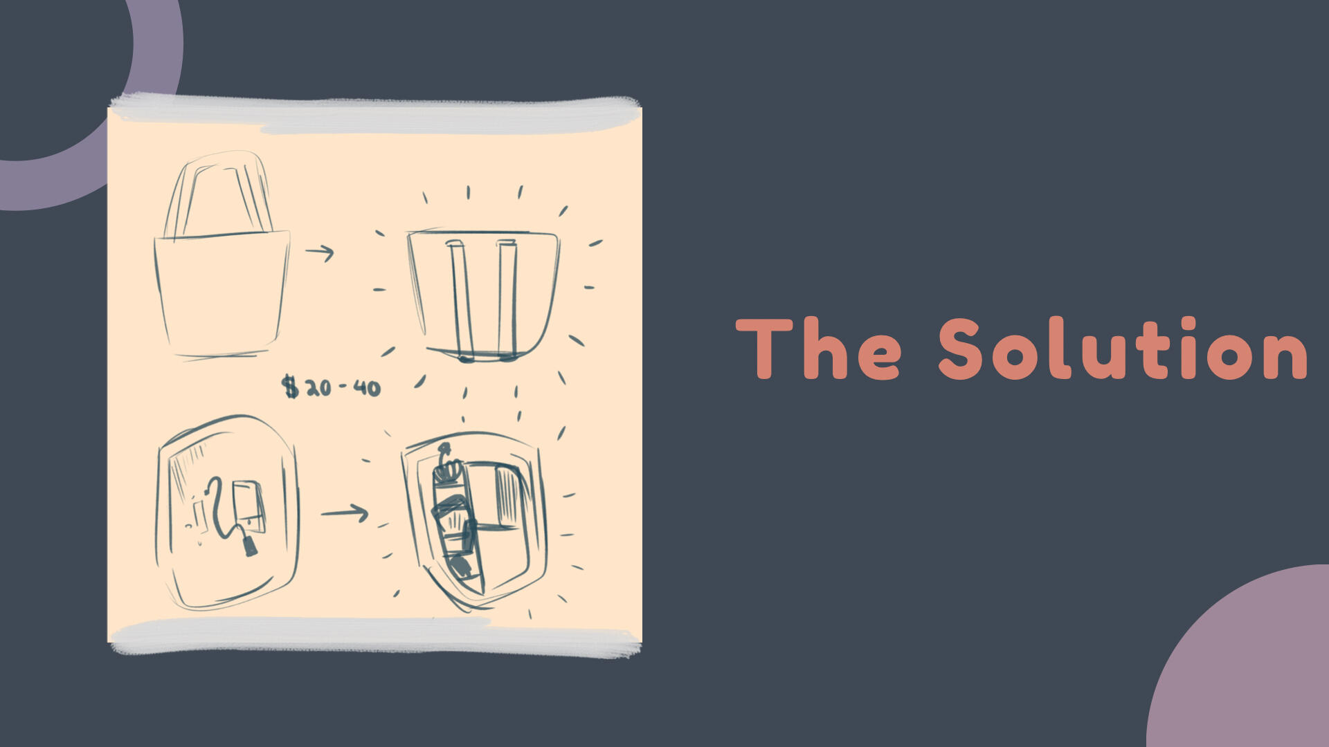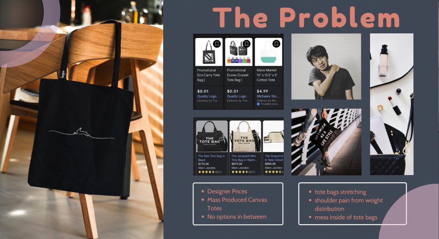 the solution we came up with1. A tote bag that would prioritize people, places, and price points that are accessible to all. This is a tote bag that will be priced within a $20-40 range, will be aimed towards philanthropic initiatives such as working with nonprofits that help communities that could benefit from a long lasting carrying device, and will be modular so that they can be used for any use: school, work, nanny responsibilities, or even an Uber eats delivery person.2. a) To tackle compartmentalization and the frequent loss of items within bags, a tote bag insert that can be swapped out throughout the day for different use cases. b) To tackle durability and quality, the tote bag will be made of high quality materials that incorporate synthetic fibers that are generated from recycled plastics and cotton shirts. c) to tackle lack of modular versatility for weight distribution, a tote bag that has convertible straps between a tote bag and a backpack.